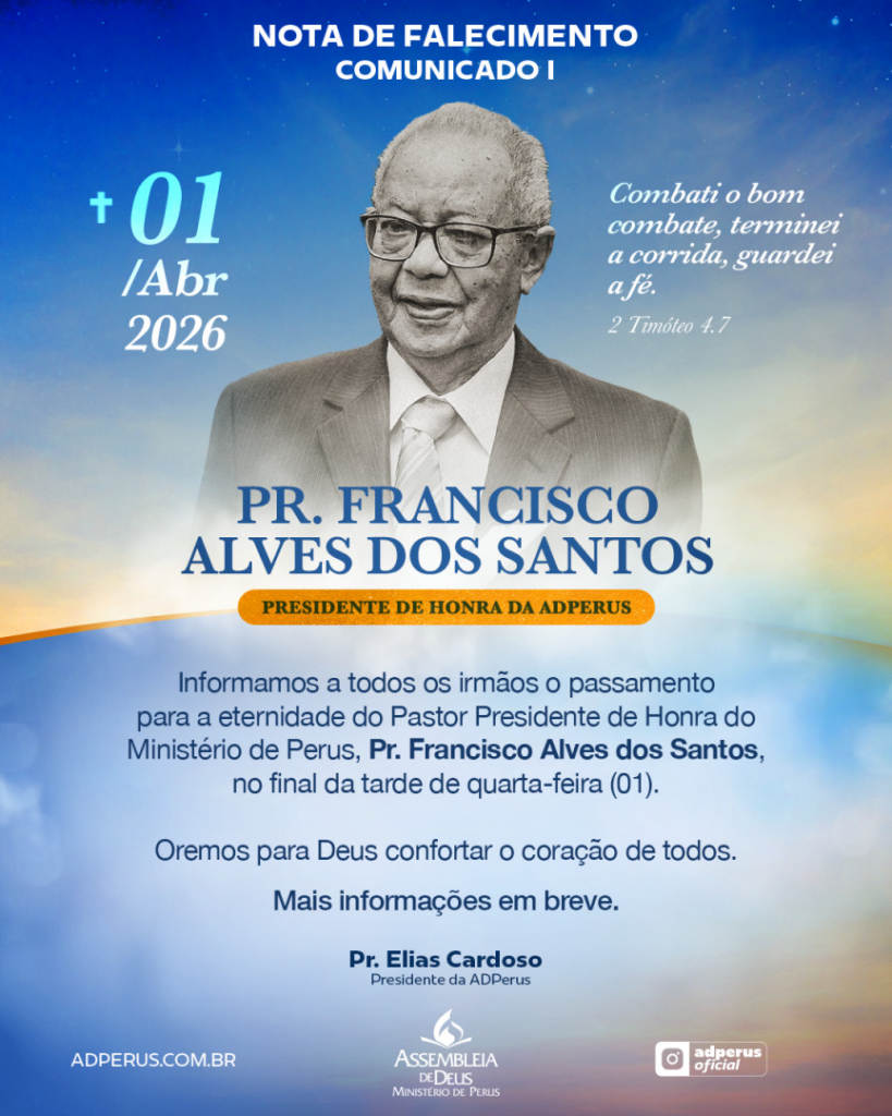O Ministério de Perus amanheceu com o coração apertado. Com profundo pesar, a Assembleia de Deus Ministério de Perus (ADPerus) confirmou o falecimento do seu amado Pastor Presidente de Honra, Francisco Alves dos Santos, ocorrido no final da tarde desta quarta-feira, 1º de abril de 2026.
